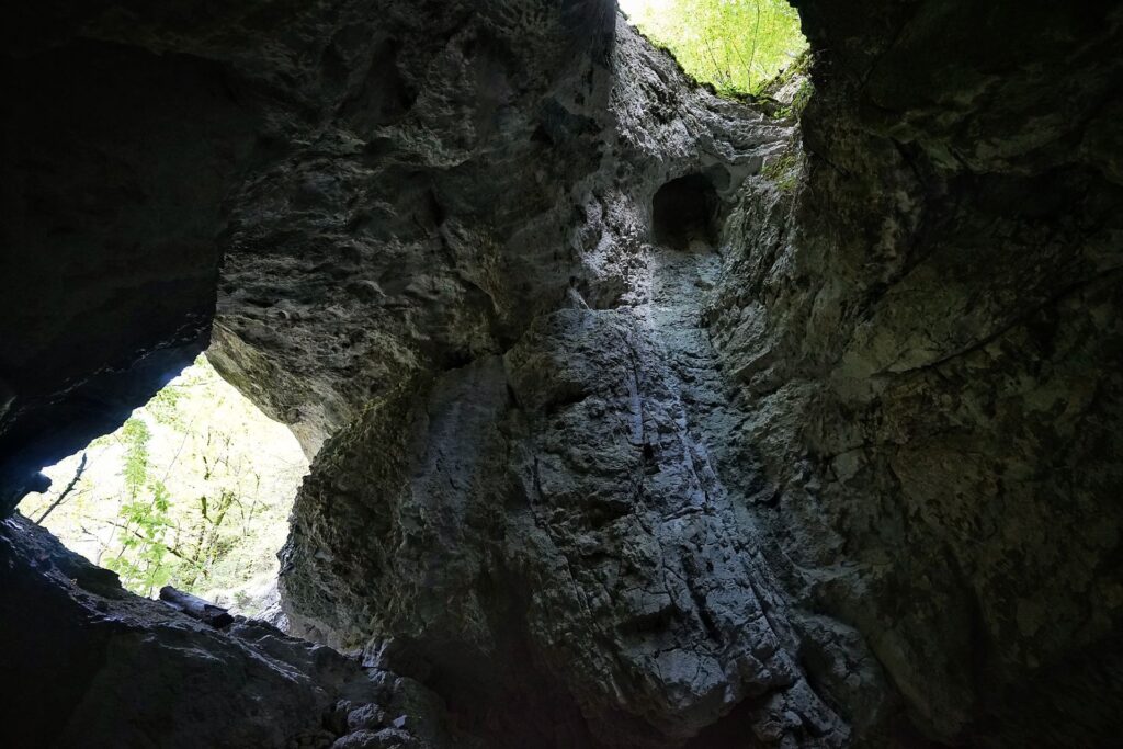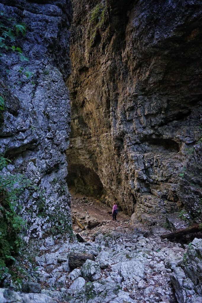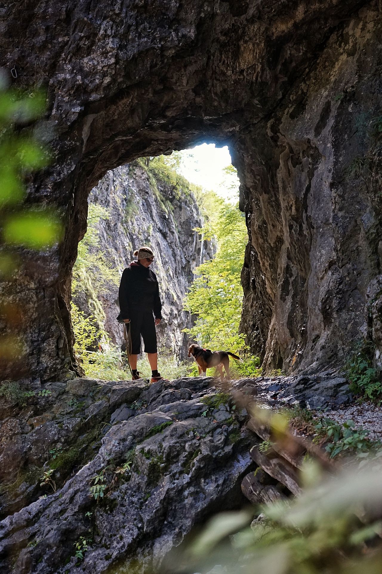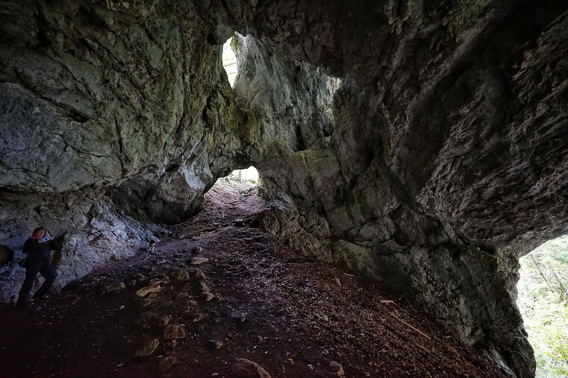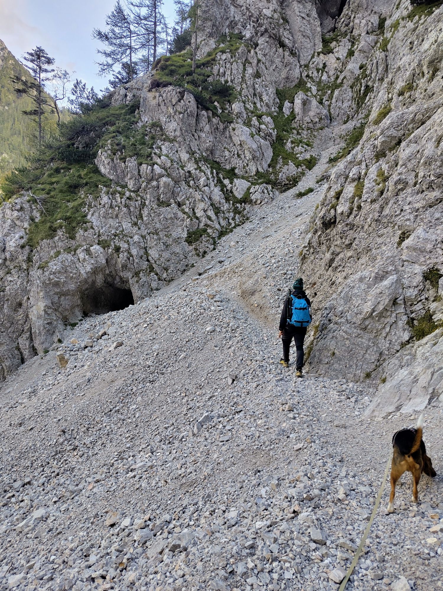 Dafür wählen wir für die Rückfahrt den Weg über den Loibelpass. An dessen Ende liegt die Grenze zwischen Österreich und Slowenien – versteckt mitten in einem Tunnel. Doch bevor wir da durch fahren, halten wir direkt davor auf einem Wanderparkplatz. Von hier aus starten viele Touren hinauf zu den schroffen, nicht mehr von Bäumen bewachsenen Gipfeln. Mit Blick auf die Uhr und das verfügbare Tageslicht ist das jedoch keine Option mehr. Dafür schlängeln wir uns auf einem schmalen Pfad entlang des Berges – angenehm immer auf der gleichen Höhe. Erst durch einen wunderbaren Mischwald, später an kahlen Berghängen. Ziel sind zwei auf der Karte eingezeichnete Tunnel. Kurz davor werden wir noch einmal durch eine kleine Kletterpassage aufgehalten, welche aber alle an Leine und Stahlseil gesichert passieren.