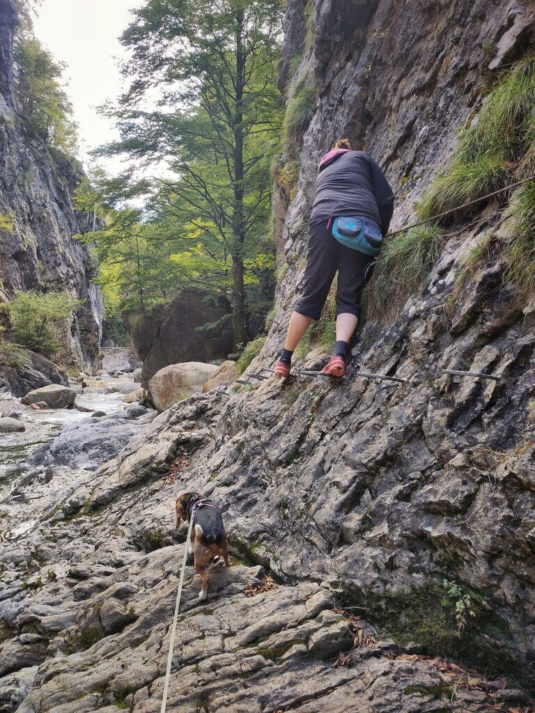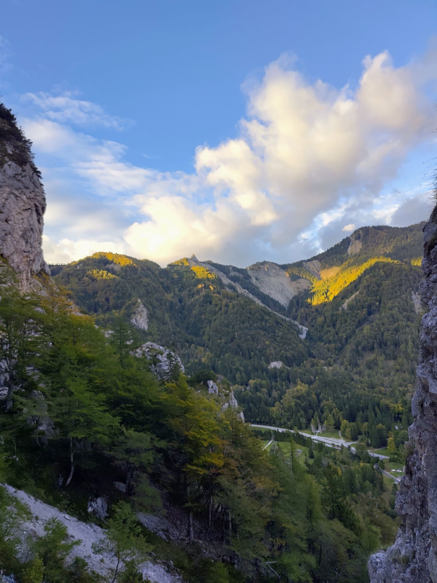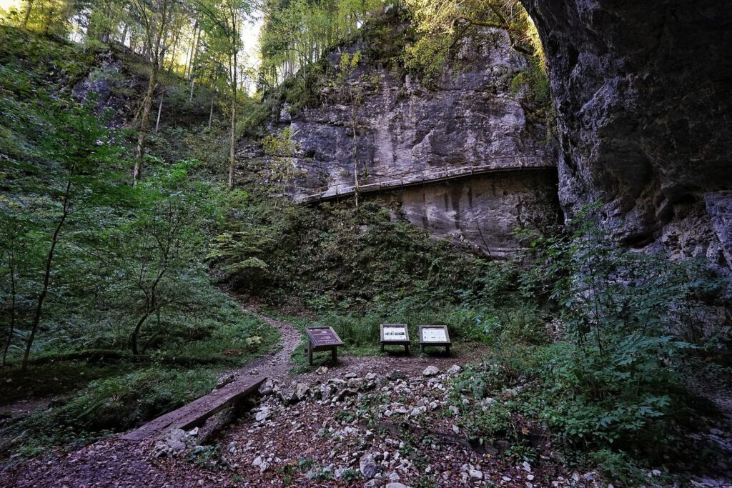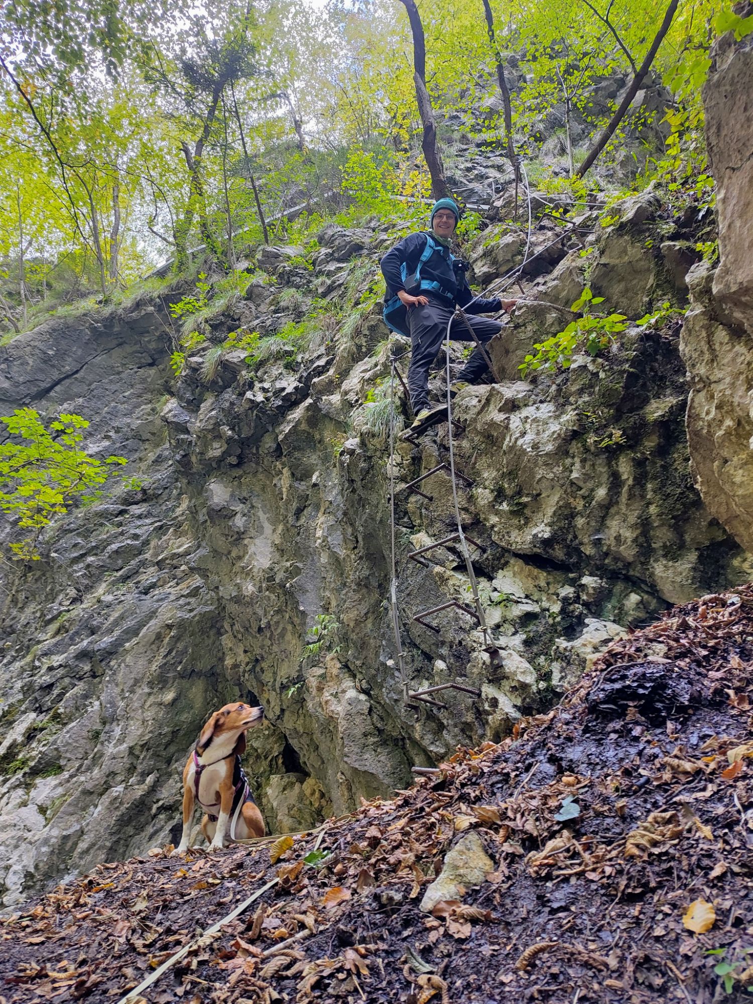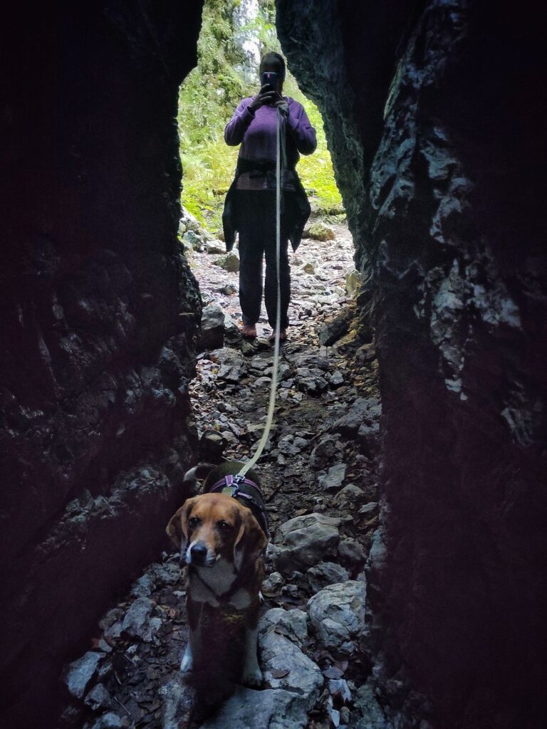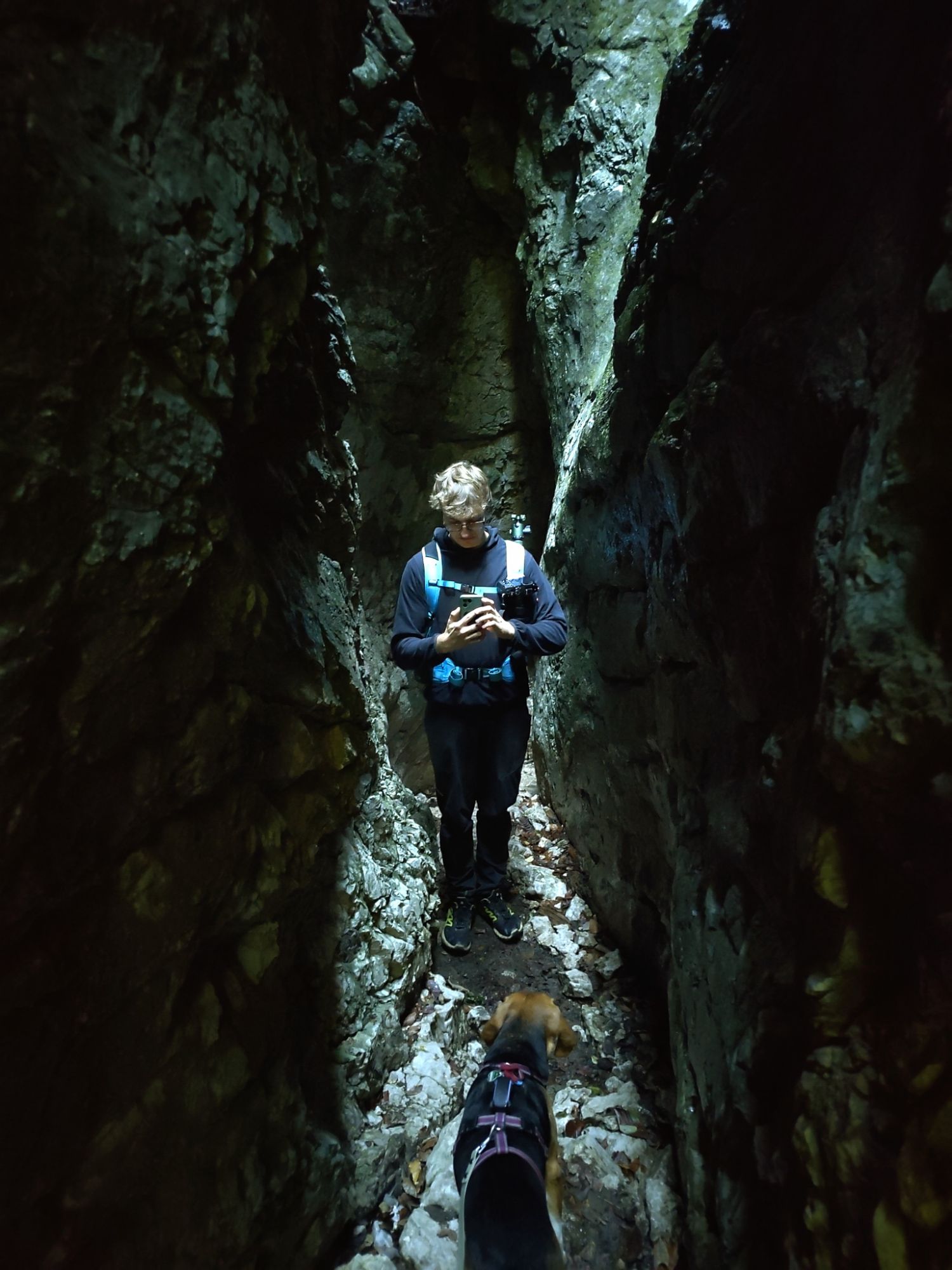 Dafür wählen wir für die Rückfahrt den Weg über den Loibelpass. An dessen Ende liegt die Grenze zwischen Österreich und Slowenien – versteckt mitten in einem Tunnel. Doch bevor wir da durch fahren, halten wir direkt davor auf einem Wanderparkplatz. Von hier aus starten viele Touren hinauf zu den schroffen, nicht mehr von Bäumen bewachsenen Gipfeln. Mit Blick auf die Uhr und das verfügbare Tageslicht ist das jedoch keine Option mehr. Dafür schlängeln wir uns auf einem schmalen Pfad entlang des Berges – angenehm immer auf der gleichen Höhe. Erst durch einen wunderbaren Mischwald, später an kahlen Berghängen. Ziel sind zwei auf der Karte eingezeichnete Tunnel. Kurz davor werden wir noch einmal durch eine kleine Kletterpassage aufgehalten, welche aber alle an Leine und Stahlseil gesichert passieren.
