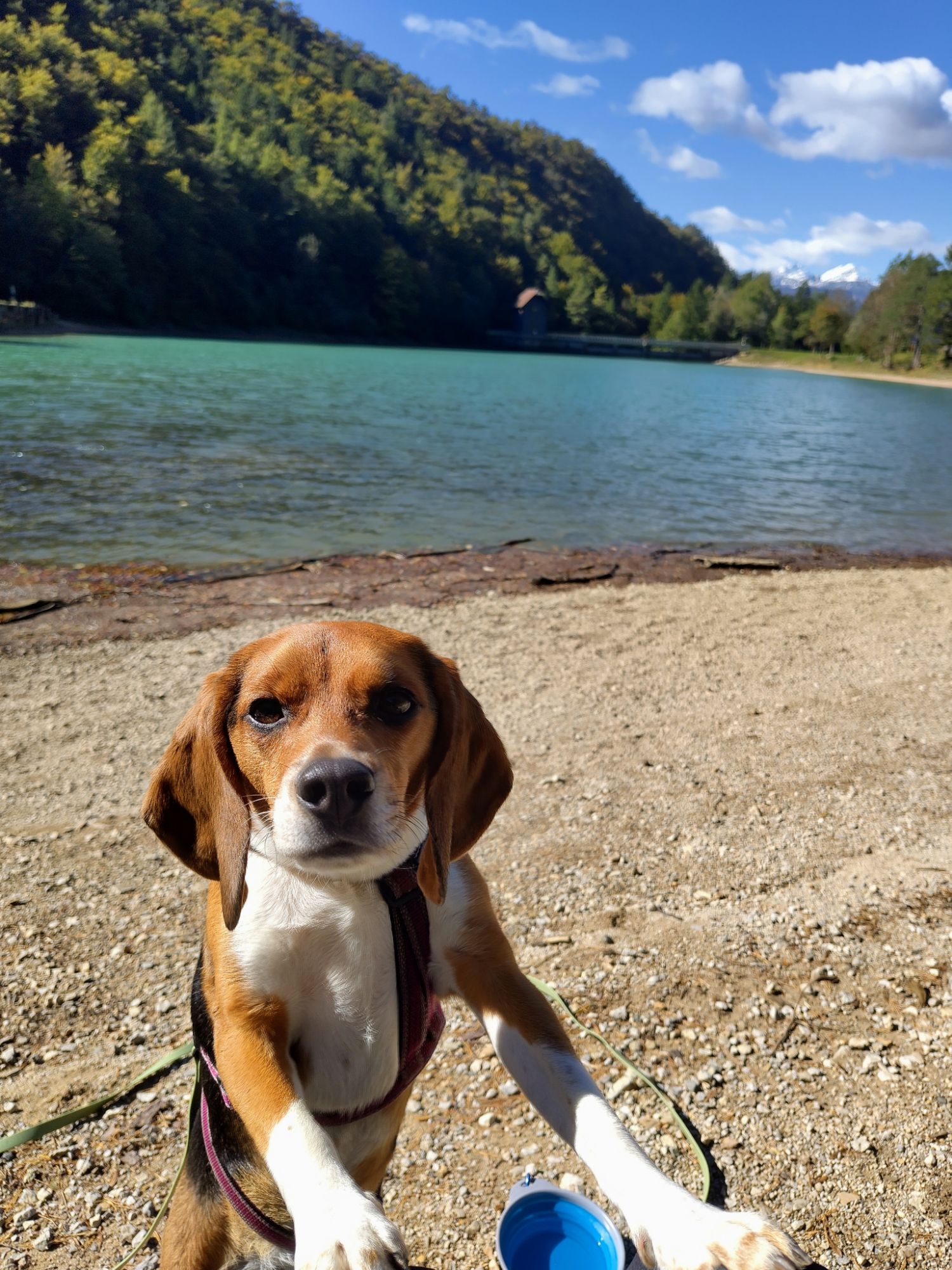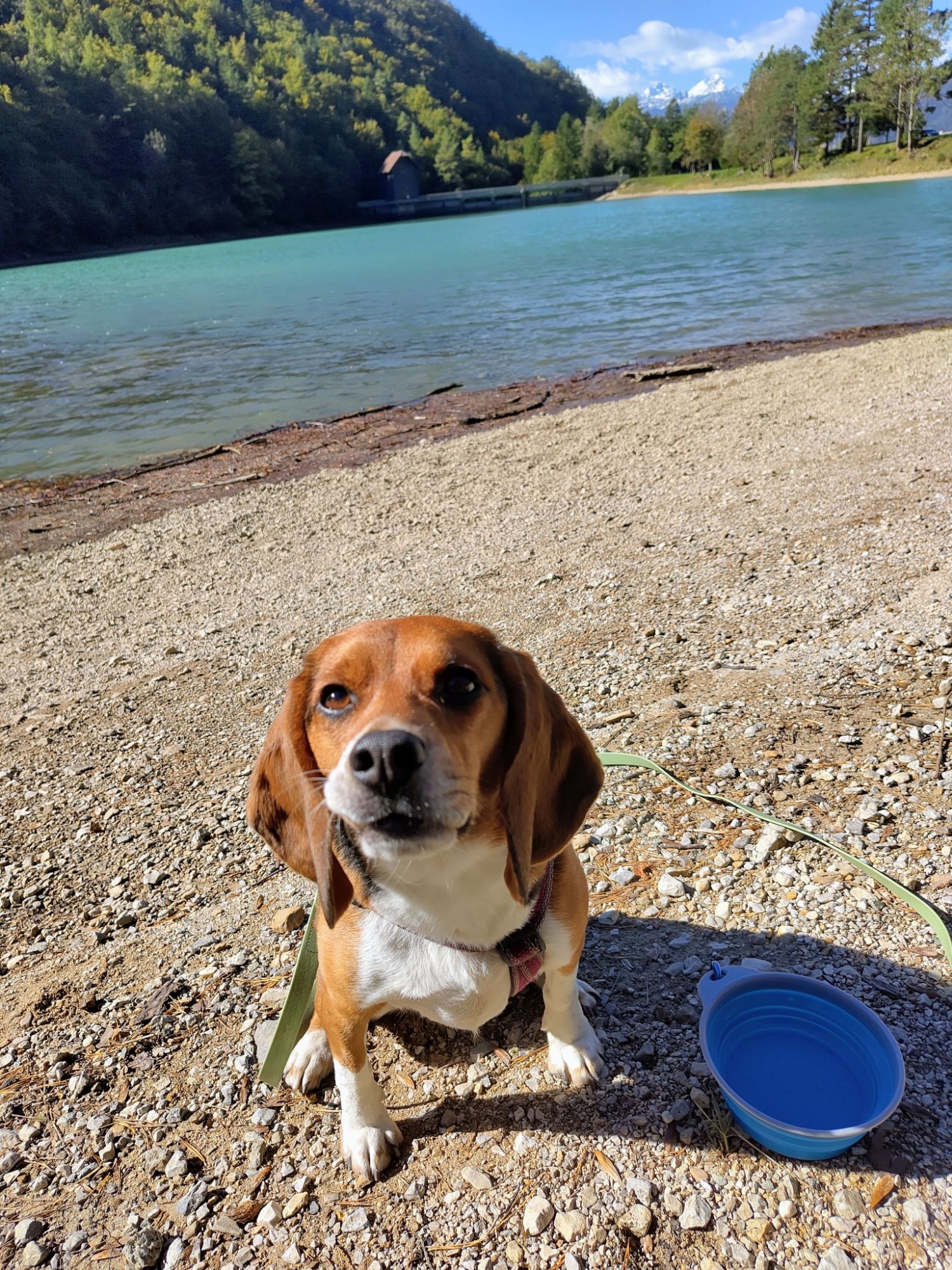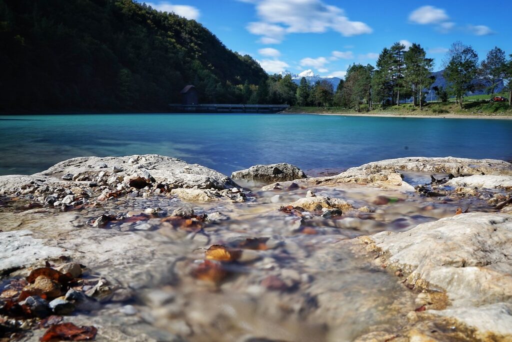 Nach kurzer Recherche ist ein neuer Plan geschmiedet und wir wechseln die Talseite. Fast gegenüber befindet sich der „Rekreacijski Park Završnica“. Diese kleine aber sehr gepflegte Parkanlage mit einem hübschen Wehr und türkisblauen Stausee lädt uns zum gemütlichen Picknick ein. Freddy genießt unterdessen das grüne Gras in der Sonne. Nach dem verspeisen der ersten Ration Proviant umrunden wir den kleinen See und kehren gemütlich zum Willy zurück.