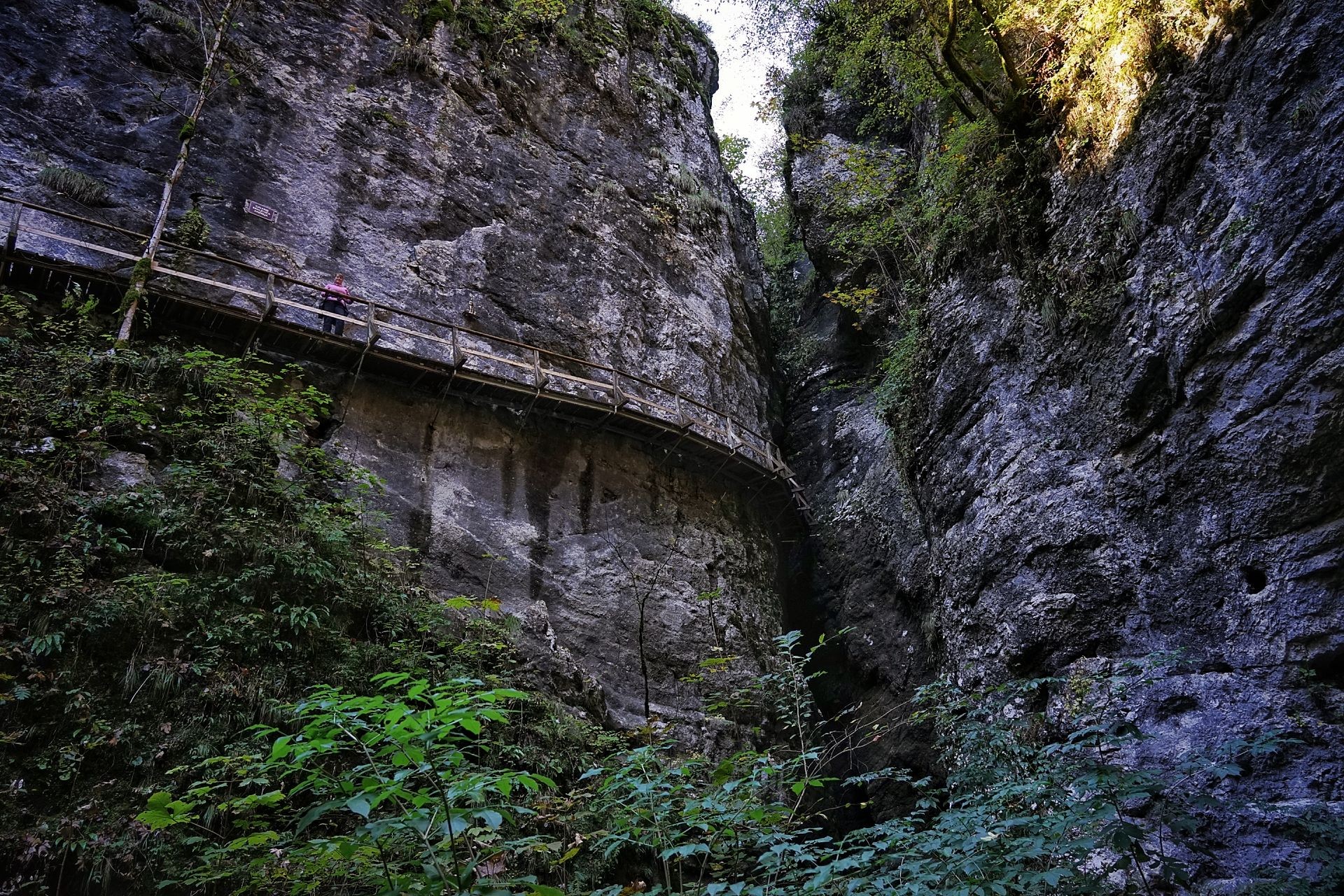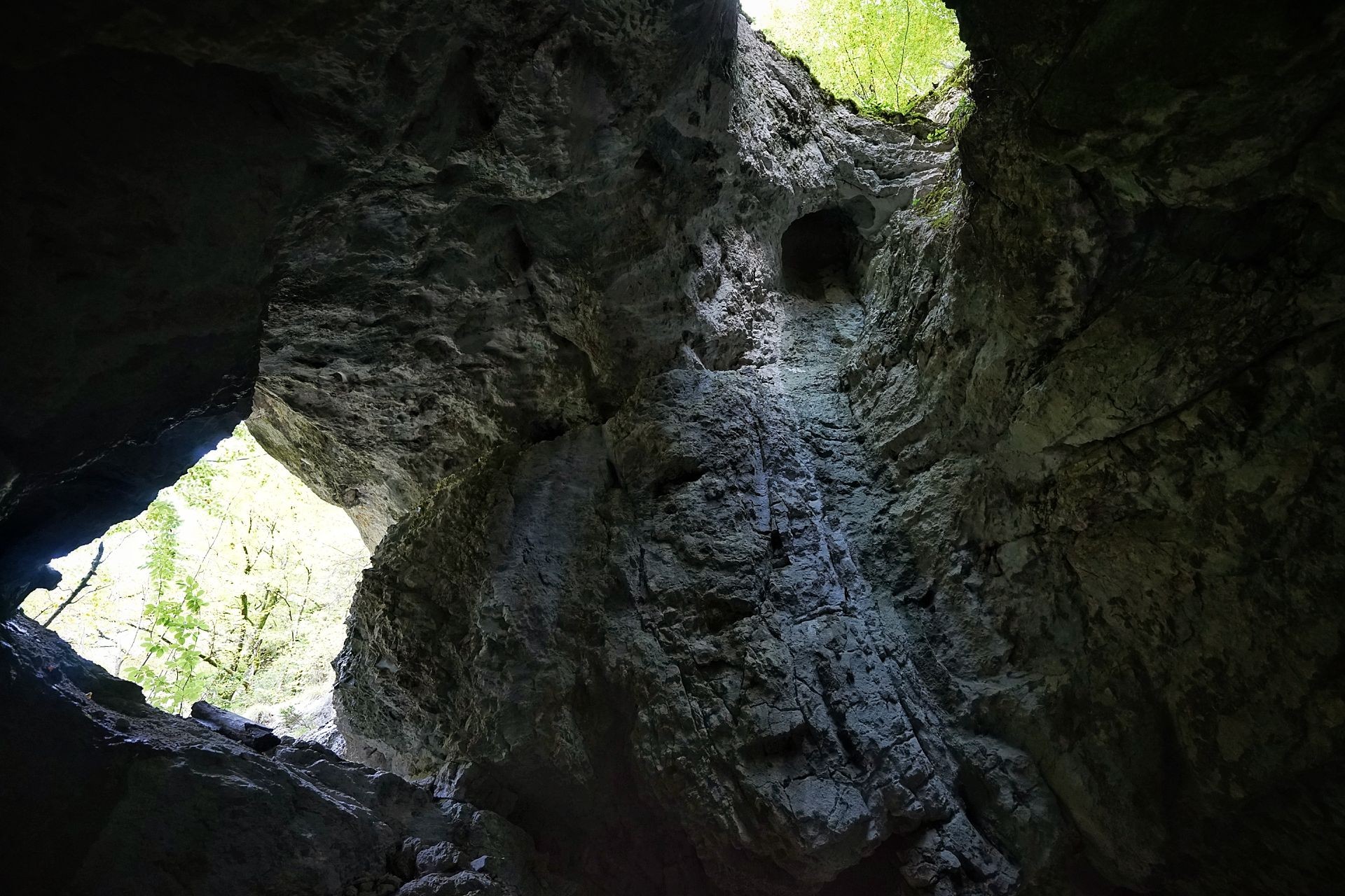 Die Schlucht selbst beginnt zunächst eher flach entlang eines glasklaren Wasserlaufs. Typischerweise ist der Weg gesät mit vielen fast weißen Kalksteinen. Nach einer Viertelstunde führt uns der Weg steil hinauf durch eine beeindruckende Felshöhle mit mehreren Lichtfenstern. Durch ein solches stapfen wir weiter hinauf zum oberen Kamm der Schlucht. Hier scheint nun auch etwas die Sonne durchs Mischwalddach. Damit fallen dann auch die ersten Hüllen: ein warmer Tag kündigt sich an.