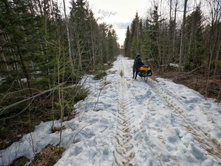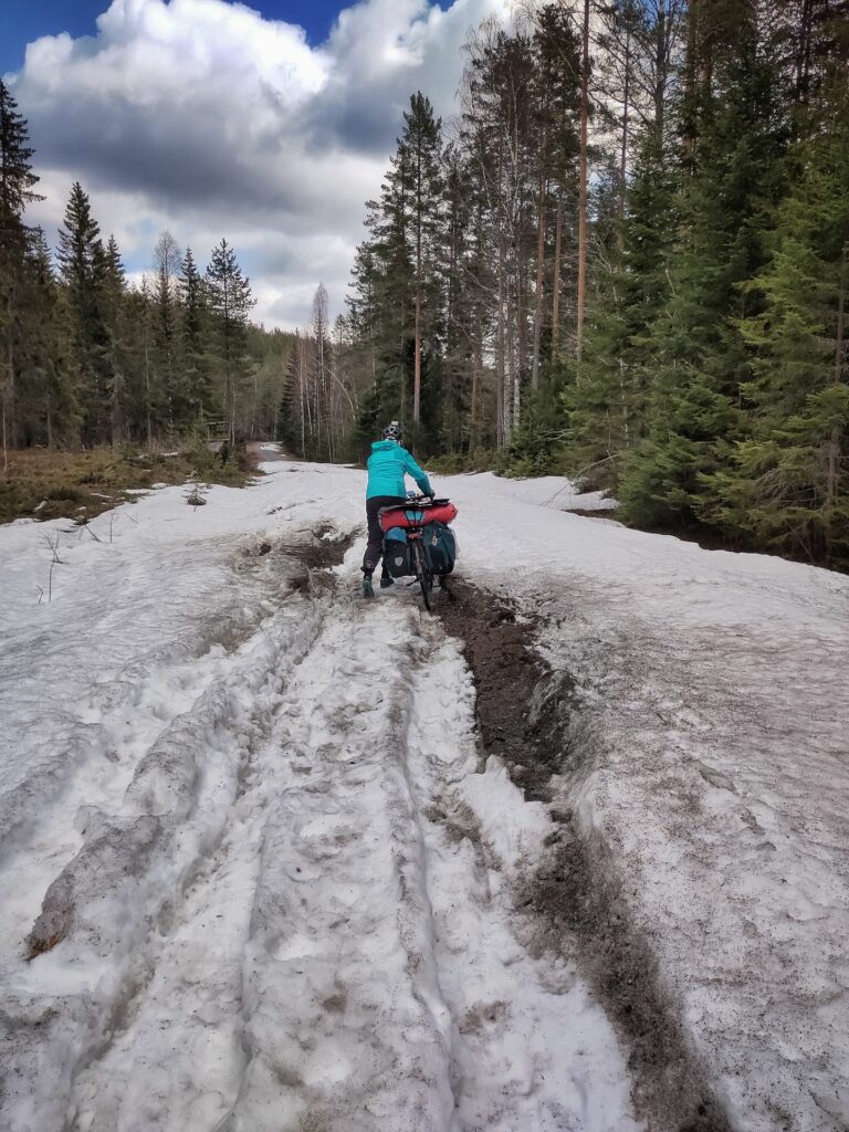 Distanz82 km Temperatur18°C in der Küche Höhenmeter674 hm Sattelzeit5:48 h Nach gestern, gönnen wir uns heute anderthalb Stunde mehr Schlaf. Dann machen wir uns aber auch so langsam fertig und räumen Sack und Pack wieder ein. Das Problem mit diesen Häuschen und dem für uns ungewohnten großzügigen Platz: alles wird irgendwohin verteilt und muss am nächsten Tag erstmal wieder geordnet werden. Dementsprechend lange sind wir mit dem Aufbrechen beschäftigt. Es ist bereits Mittag, als wir uns auf eine erneute Schneewanderung begeben. Mit dem bisschen Übung vom Vortag klappt es auch schon ganz gut. Und dann geht es ja erstmal bergab.…