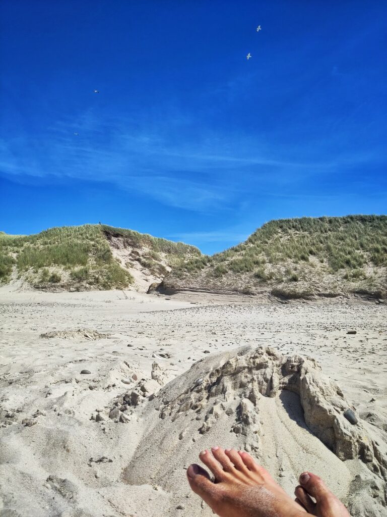 Nachdem das Wetter gestern bereits sommerlich warm war, sollte es heute nochmal etwas besser werden. Daher blieben wir nicht allzu lange liegen und machten uns nach dem Frühstück direkt auf nach Thorsminde. Hier deckten wir uns mit Fisch für Zuhause und den Abend ein. Nachdem wir selbigen im Ferienhaus kühl gebettet haben, ging es dann direkt zum Strand. Dabei verließen wir uns auf den vor einigen Tagen ausgekundschafteten Strandabschnitt etwas außerhalb. Als wir ankamen waren wir das zweite Auto. Entsprechend leer war der Strand abermals. Bild des Tages Der Himmel überuns erstrahlte im reinsten blau und die Sonne brutzelte unsere…