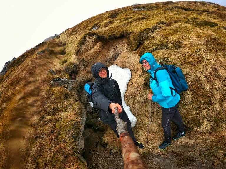 Distanz0 km Temperaturangenehm warm Höhenmeter788+ hm zu Fuß Sattelzeit0:00 h Unseren Schlafplatz haben wir strategisch so gewählt, dass die Anreise zum Ausgangspunkt der heutigen Wanderung möglichst kurz ist und so müssen wir nach Ausschlafen und Frühstück nur die Straßenseite wechseln um an den Start zu gelangen. Ziel soll der Gipfel des Matmora sein. Wie auf den Lofoten üblich, gibt es keine Aufwärmphase: wir passieren ein Gatter und hundert Meter später geht es bereits steil bergauf. Zunächst durch ein hübsches Wäldchen über einen gut ausgetretenen Trampelpfad. Ein bisschen Regen steckt noch im Boden aber um nasse Füße müssen wir uns wohl…